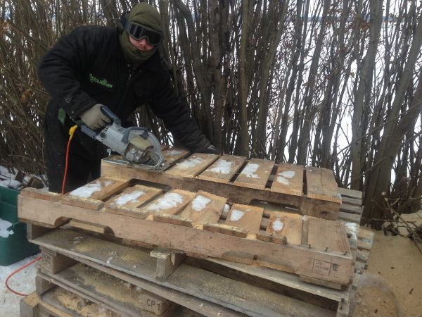 A few years ago, all of these wooden skids (sometimes known as pallets) would have been destined for landfills. New legislation outlawed putting skids into landfills in North America.