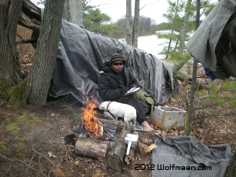 The wind started to pick up and we used the silver tarp to create sitting pads as well as a windbreak to make our stay more comfortable. Sean curled up in his wool blanket with my dog and we relaxed and enjoyed the fire.