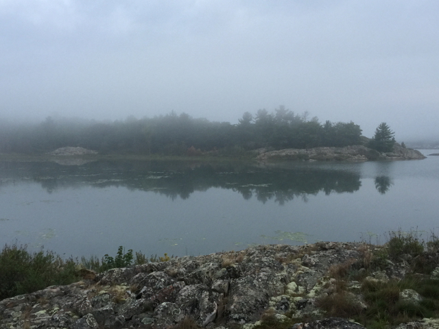 Heading westbound through Collins inlet revealed dozens of smooth, weather battered small islands of solid pink granite. Some as small as a compact car, others the size of a house. The waves gently pushed up against them as we paddled by. There was very little noise except for the the roar of the wind pushing through the white, red, and Scotch pines that lined the inlet on both sides. When wind hits these pine trees, it roars like a waterfall. It’s a beautiful and haunting sound.