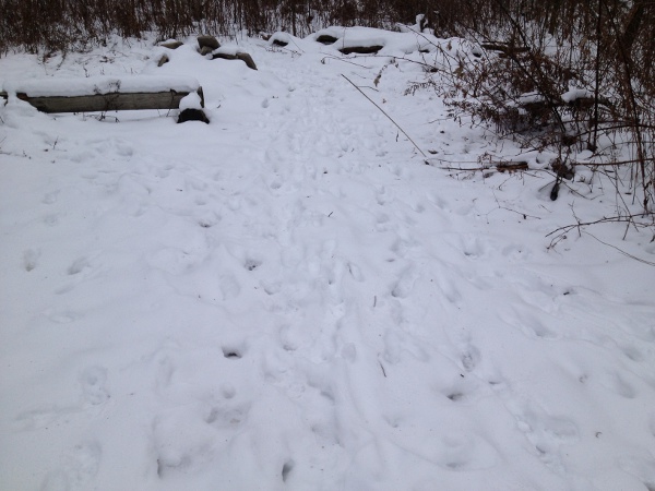 The muddy paths that hikers use, now covered with fresh snow, will often be littered with animal prints. Large open fields will often have tracks strewn about them.