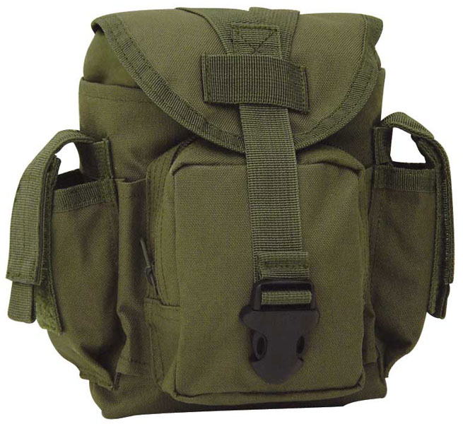 The New Voodoo Tactical Molle Universal Modular Dump Pouch can attach to your universal vest, platform, or range bag. Perfect for slashing extra magazines. Two side covered adjustable pistol magazine pouches, inner full sized compartment with drawstring extended collar, outside zippered front pouch for loose rounds, more mags, etc. Two front pencil/pen slots (pen not included). Full flap cover with fixed side-release buckle. Measures 9″ x 9″ x 2″.