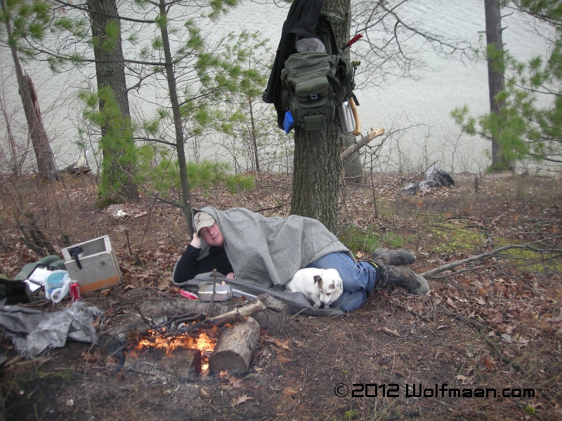 The wind started to pick up and we used the silver tarp to create sitting pads as well as a windbreak to make our stay more comfortable. Sean curled up in his wool blanket with my dog and we relaxed and enjoyed the fire.