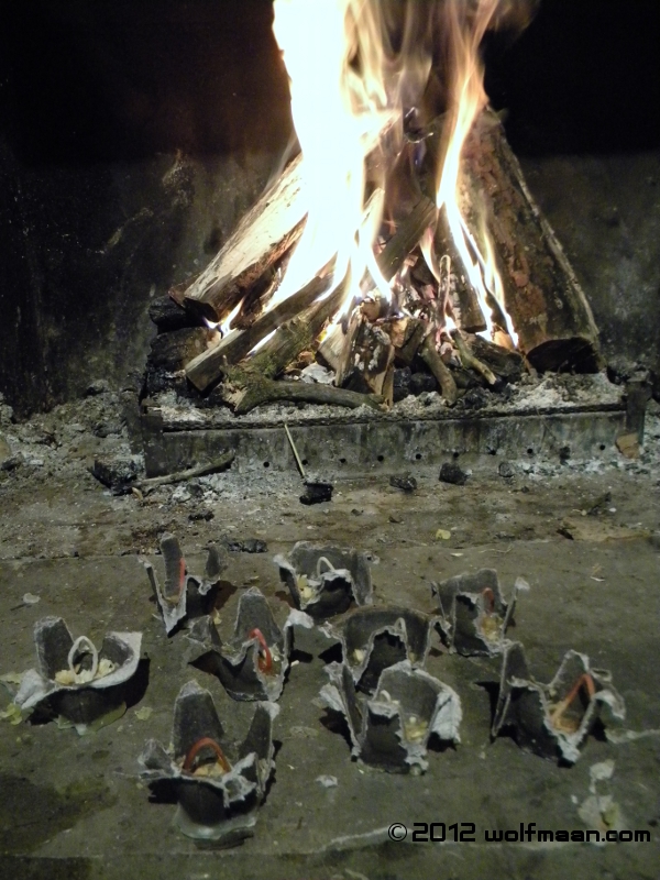 Fill each of the egg carton holders with the clean animal shavings, then pour in the hot wax.