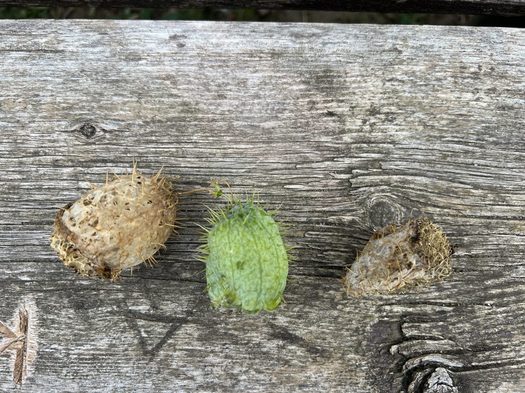Echinocystis lobata, commonly known as wild cucumber, is a native vine that thrives in the deciduous woodlands and along the edges of water bodies in Southern Ontario. Its name is derived from the Latin “echinos” (meaning spiny) and “kystis” (meaning bladder), referring to the plant’s distinctive, spiky seed pods.